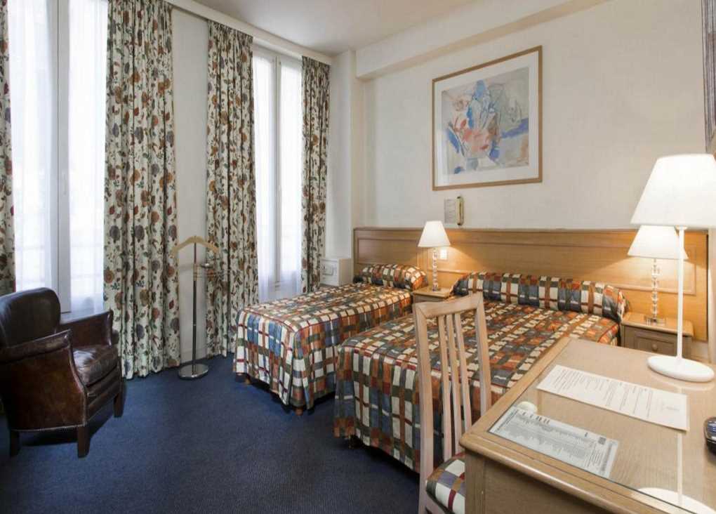 É um hotel 3 estrelas, situado num edifício tradicional no estilo Haussman. Ele fica em frente ao Maison de la Mutualité (centro de conferências) e a poucos metros da Estação de Metro Cardinal Lemoine. Esse hotel tem um ótimo preço para a região. Por sua localização e preço, eu considero uma ótima opção em Paris. Preços aqui.