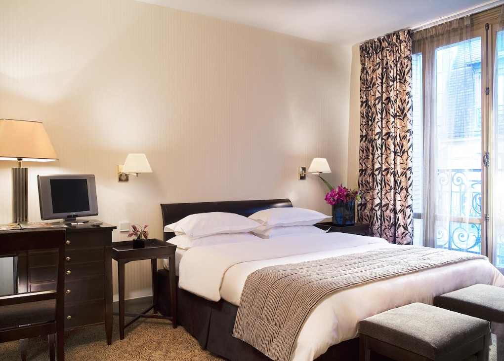 Além de ser um hotel bem localizado em Paris, ele é considerado muito limpo e o staff muito amigável. Os quartos tem ar-condicionado, o que se torna muito importante em Paris se você estiver indo no verão. Paris faz muito calor nos meses de julho e agosto, e muito hotéis não tem ar-condicionado. O hotel também fica bem perto de uma estação de metrô com acesso direto à Chatelet e ao Louvre. Preços aqui.