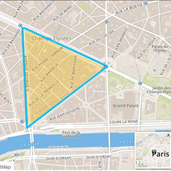 Principais atrações na área: O Arco do Triunfo e o Grand Palais, o Triangulo dourado, e a avenida Champs-Elysee.